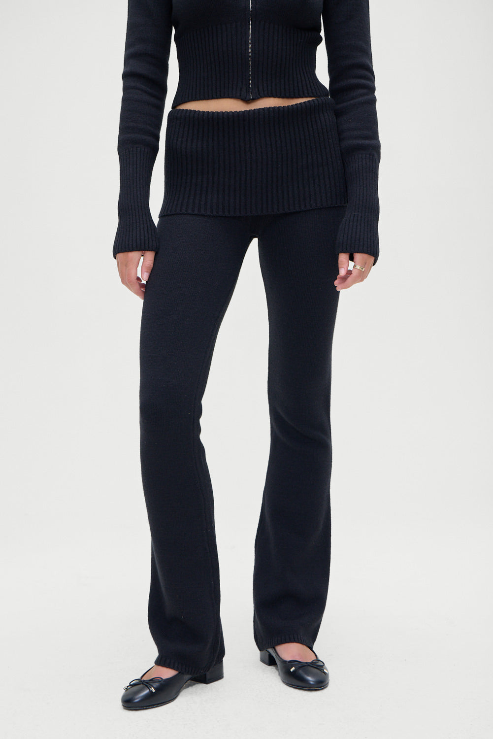 - Ribbed fold-over waistband